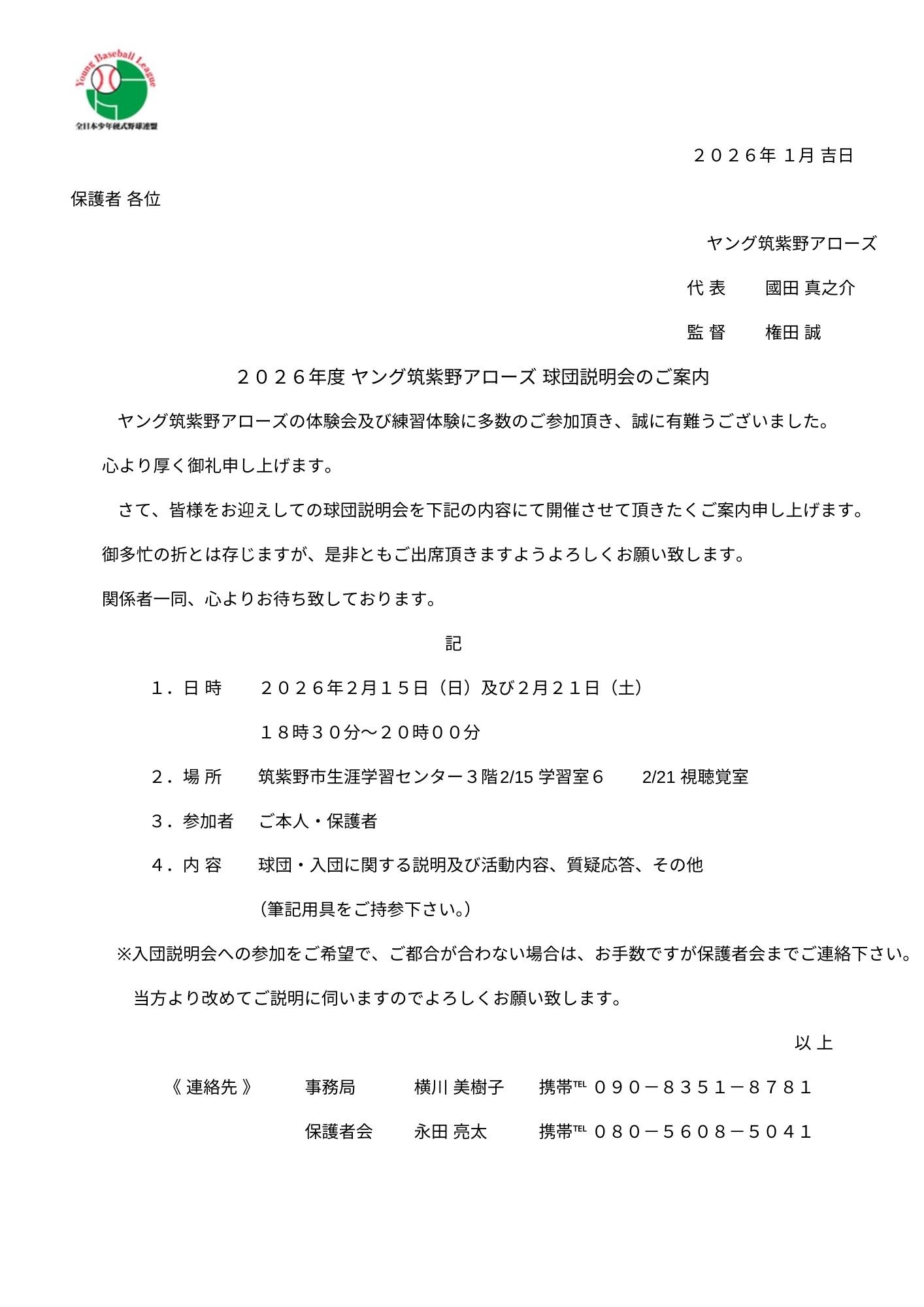 入団をご検討の方は勿論、アローズがちょっと気になる、話を聞いてみたい、等々どなたでもご参加可能です。皆様のご参加をお待ちいたしております。